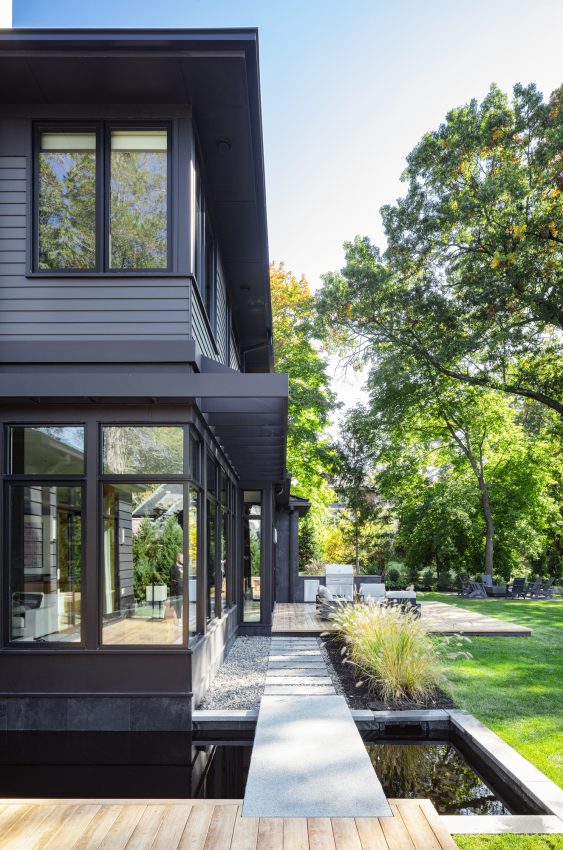 The design is stripped of ornamentation but evokes warmth through textures and materiality. Floors, built-ins, and cabinetry are white oak or painted black, and countertops are white quartz. We used varied shades of black to create depth on the facades, from the darkest black window frames to gunmetal siding to charcoal porcelain tile with shimmery veining. The home’s black exterior, its broad planes of glass, and use of water in the landscape create the effect of the building receding into itself, becoming a canvas for the natural surroundings.