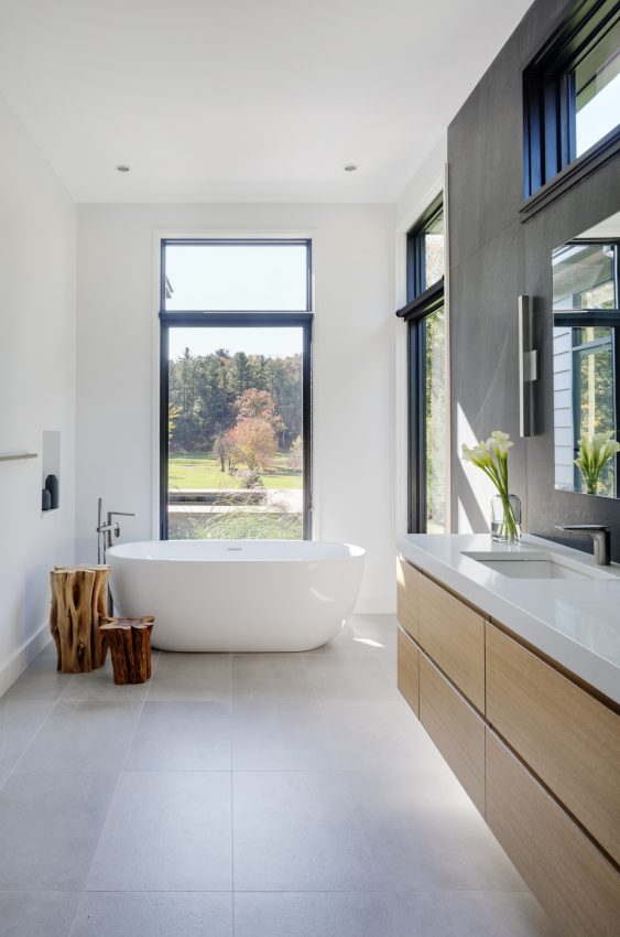 To create a sense of passage and retreat, LDa designed the primary suite as a pavilion separated from the main house by a glass vestibule. With floor-to-ceiling windows and ceramic tile flooring to match the bluestone terraces, the vestibule appears to bridge a reflecting pool in the landscape before reaching the owners’ sanctuary.
