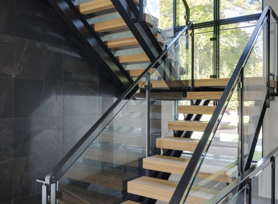 On the main level, each room opens to expansive views and natural light, blurring the lines between inside and out and creating a serene and light-filled backdrop for every space. A design language emphasizing horizontal lines and uninterrupted flow of space connects the home to the landscape and evokes a strong modern aesthetic.