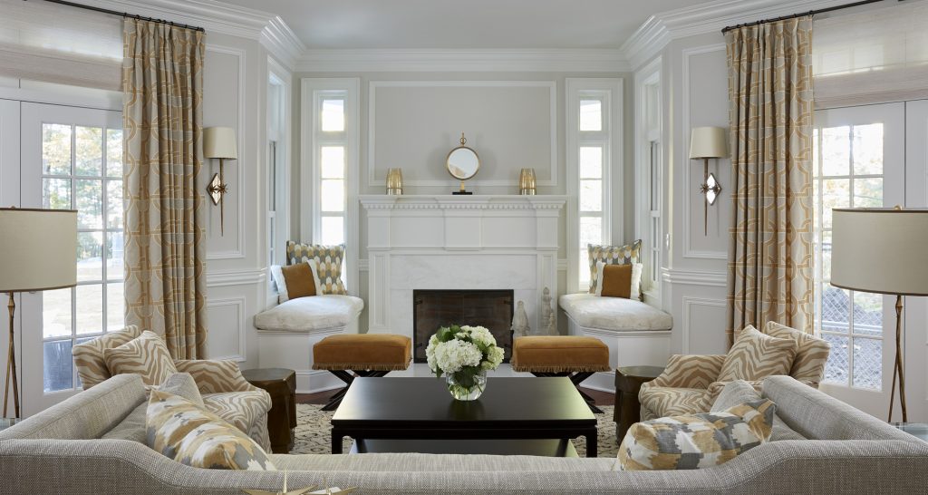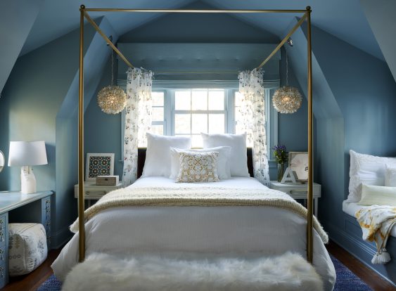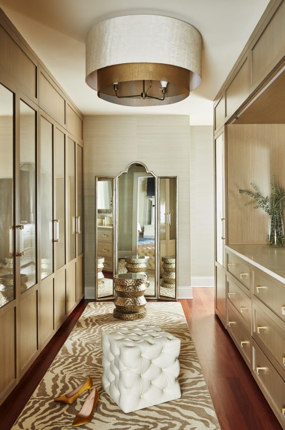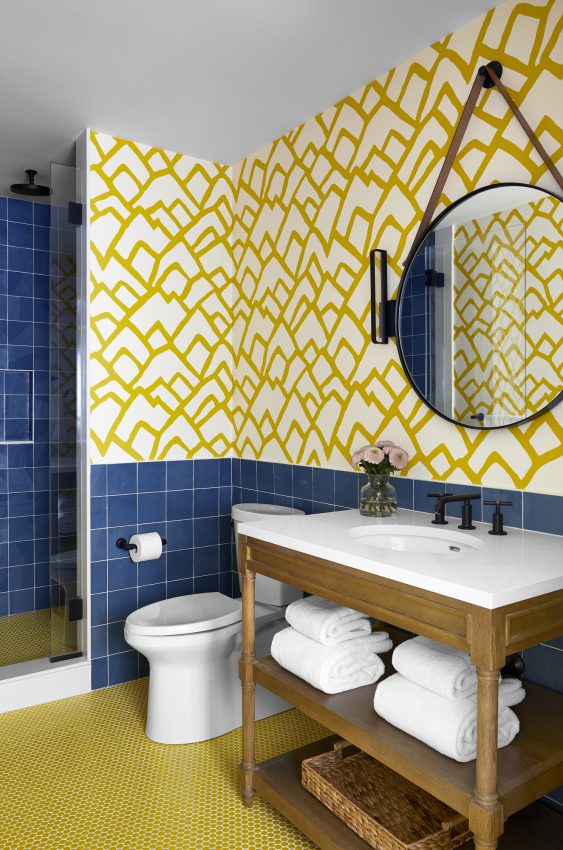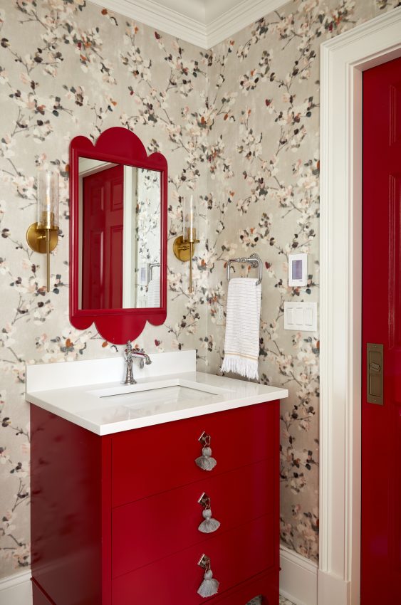 The project involved the renovation of seven bathrooms in a wide variety of styles, ranging room the fun yellow patterned wallpaper and penny tiles of the basement bath, to the sweet floral paper and bright red vanity, door, and mirror combo in the daughter’s bathroom, to the glamorous gold and neutral tones in the guest bath. In the primary suite, two closets were combined to create a sophisticated dressing room, and the blue jewelbox bedroom came to life based on the homeowners’ daughter’s wishlist.