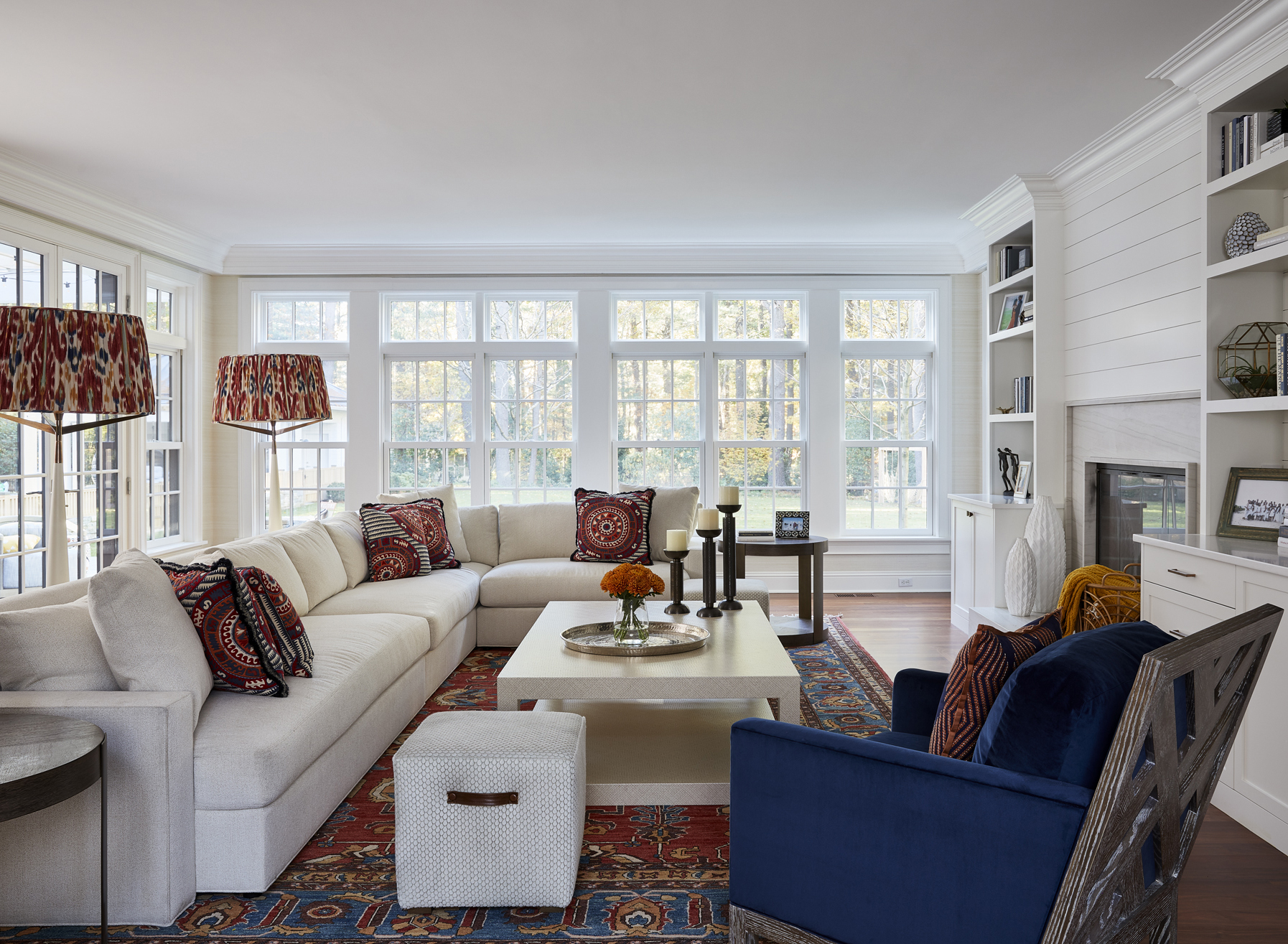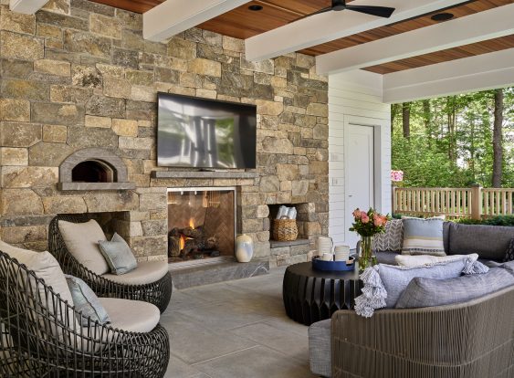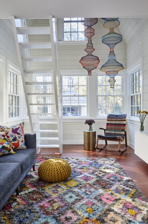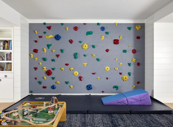 Several of the home’s renovations involved creating kid-friendly spaces for the whole family to enjoy. Adjacent to the kitchen, a former sunroom was converted into a light-filled playroom, complete with creative toy and game storage, colorful furnishings, and a play loft. In the previously unfinished basement, new spaces include a cozy media room with a climbing wall, arts and crafts bar, and “playhouse” built into a nook under the stairs as well as a large home theater featuring a retractable movie screen, a “stage” for performances, and theatrical lighting.