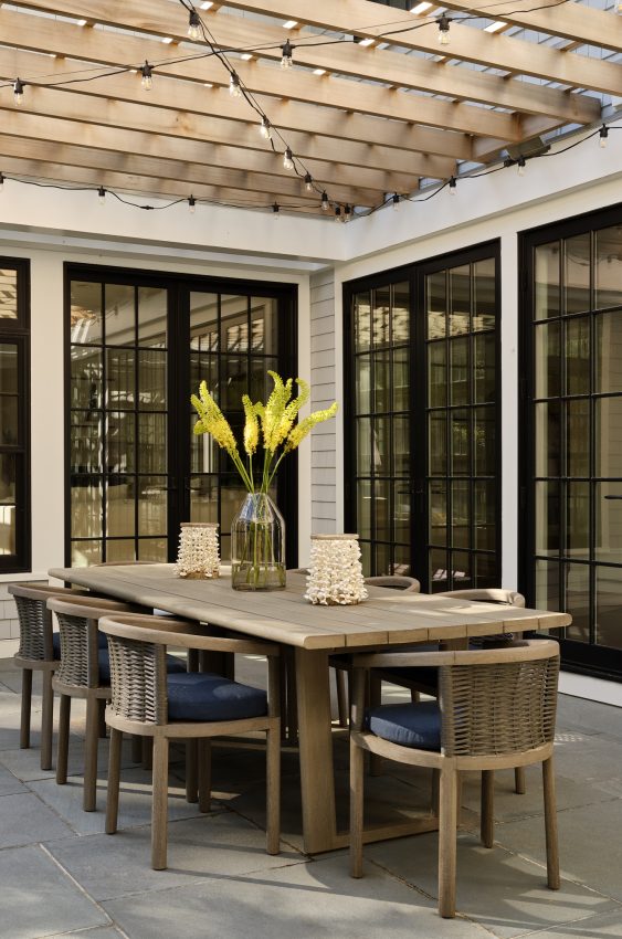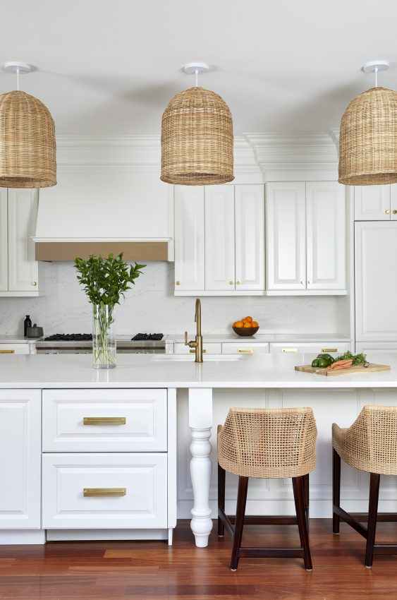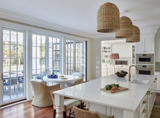 The refreshed kitchen is proof that selected updates can have a big impact. While the cabinetry and layout remained the same, a new backsplash, countertops, pendants, hardware, and bronze trim added to the range hood, paired with repainted millwork and several new appliances, give the room a completely new look. In addition, a wall of cabinets along the back of the home was replaced by three pairs of oversized French doors that open to a new pergola-covered patio, dramatically increasing the kitchen’s natural light and enhancing connections between the home and its expansive backyard.