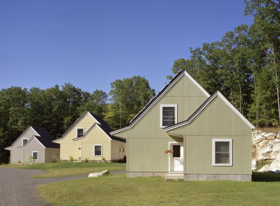 The six 2-bedroom and five 3-bedroom single-family houses were carefully placed around an oval drive, ensuring that the abutting units do not obstruct sunlight or views from the primary windows, and that all units have access to both the woods and the community lawn. The buildings were designed for potential future expansion in the attic areas.